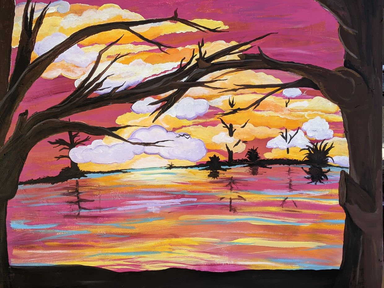 Sunrises and sunsets are times of renewal, rebirth, and acceptance of the natural cycles of life. This 48-inch x 36-inch Acrylic painting celebrates those moments when the sun is on the horizon, the sky is on fire, and magic is creeping in on the clouds.